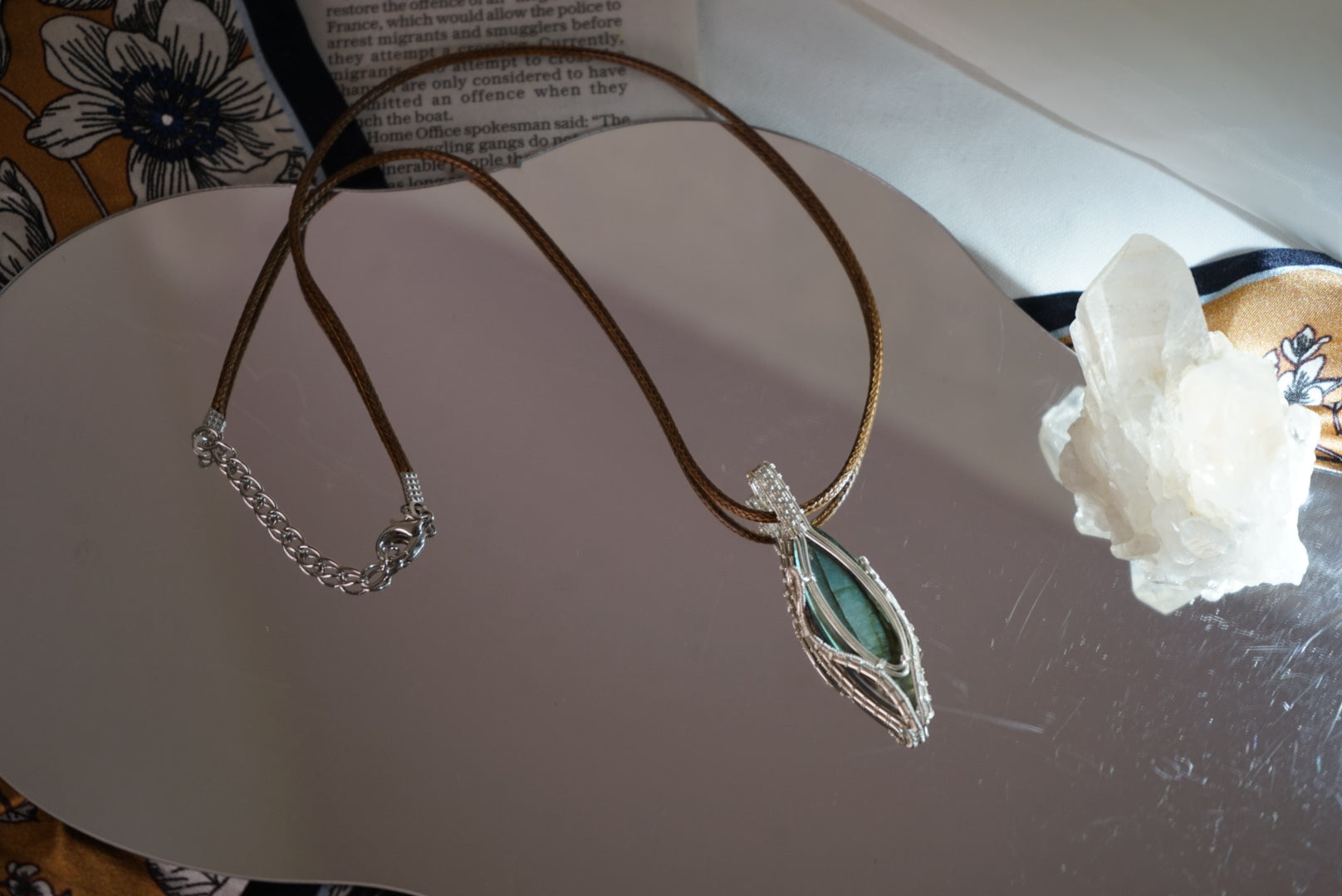 This handcrafted pendant features a mesmerizing marquise-shaped labradorite stone, known for its magical iridescent glow. Wrapped in white copper wire, each curve and twist is carefully shaped to cradle the stone like a secret from the forest.